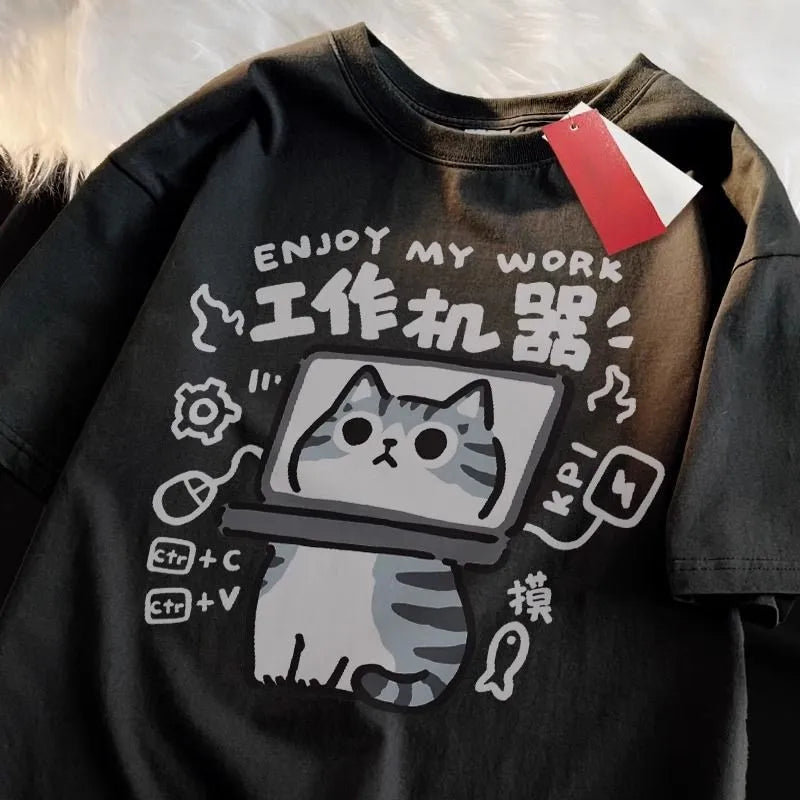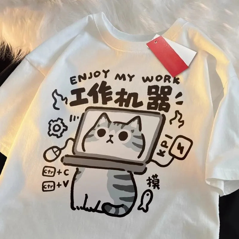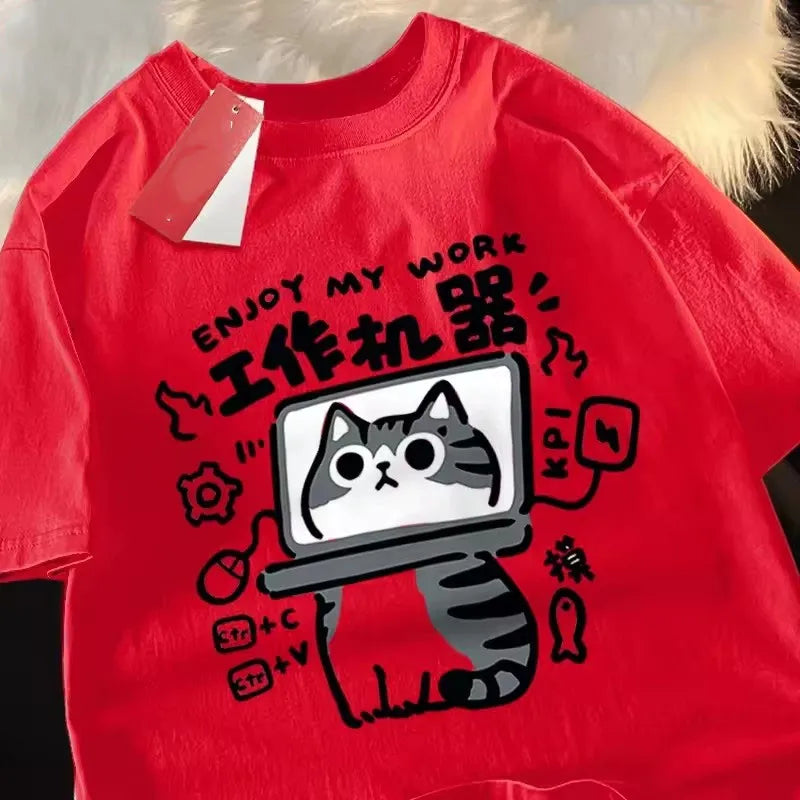 This casual summer T-shirt features a loose fit with a round neck and short sleeves, made from slightly stretchy polyester broadcloth for comfort. Designed for women, it showcases a playful cartoon pattern and regular length, ideal for warm weather wear. Crafted without harmful chemicals, it offers a simple yet stylish option for everyday casual outfits. For a more comfortable or oversized fit, consider selecting one to two sizes larger than your usual size.