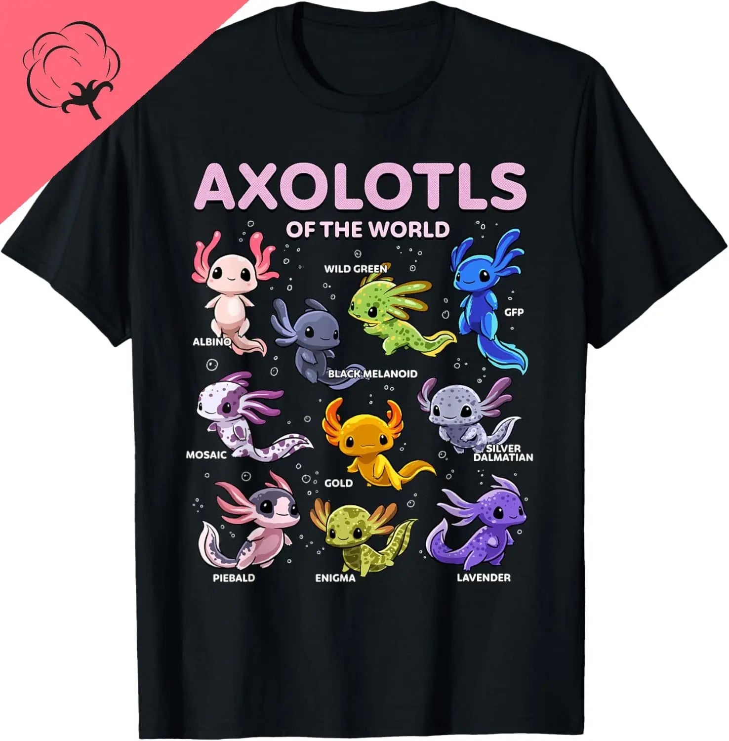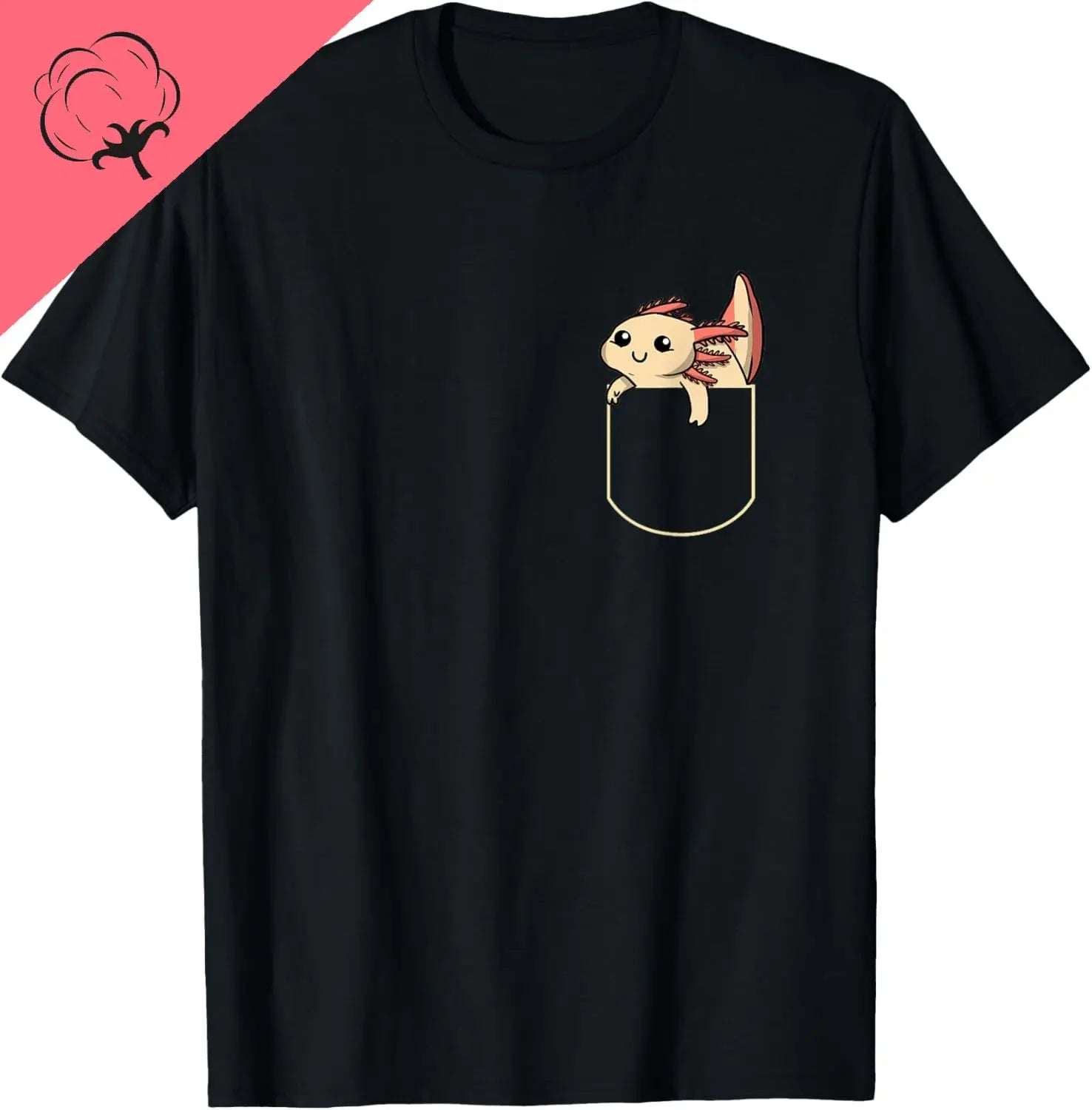 This cotton t-shirt features a cute axolotl cartoon design, perfect for fans of Japanese anime and casual wear. It offers a true-to-size regular fit with medium stretch, short sleeves, and an O-neck collar for comfortable all-season use. Suitable for men, women, and youth, it supports hand washing and is ideal for everyday casual style. Available for wholesale.
