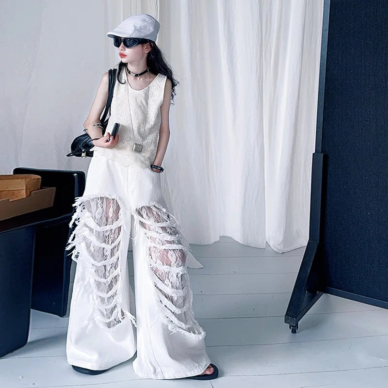 This girls' summer outfit set includes a sleeveless cotton knit T-shirt and broken pants, designed for ages 7 to 13. The casual, true-to-size fit features a solid pattern and lightweight fabric, perfect for warm weather streetwear. Made without harmful chemicals, it offers comfortable, stylish wear for active kids. Available for wholesale.
