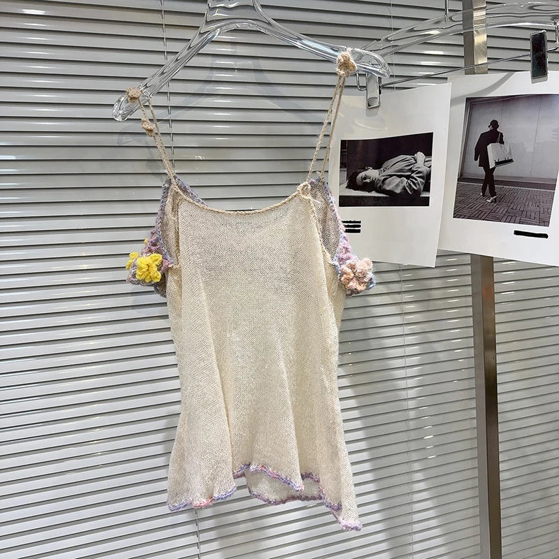 This slim knit camisole vest features a colorful embroidered floral design, crafted from a slightly stretchy polyester blend for comfort. Designed for women, it offers a versatile, backless style suitable for various occasions. Its short length and floral pattern make it a stylish choice for all seasons.