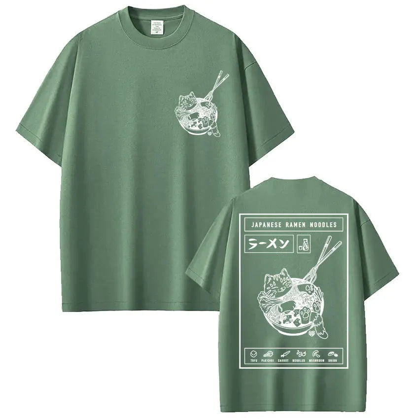 This Japanese-style ramen noodles cat meme T-shirt offers a breathable, loose fit made from 100% pure cotton broadcloth with a knit texture. Designed for all seasons, it features a comfortable O-neck and short sleeves, making it ideal for casual streetwear or vintage-inspired looks. Available in multiple colors and sizes from XS to XXXL, this unisex tee combines fashion and comfort effortlessly for everyday wear.