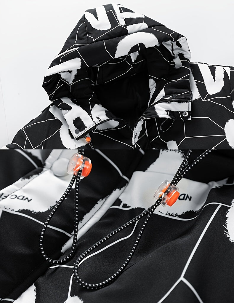 This hooded jacket features a regular fit and zipper closure, made from durable 100% polyester fabric with alphabet print. Designed for fall and winter, it is machine washable and offers comfortable, non-stretch wear.