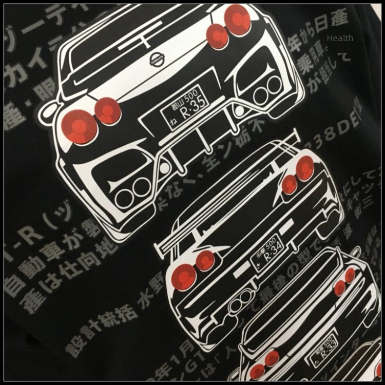 This Japanese-style Nissan GTR T-shirt features 100% cotton fabric with a loose fit and short sleeves, making it comfortable for daily wear throughout the year. Designed for youth with a crewneck collar, it combines style and casual comfort in a popular trend.