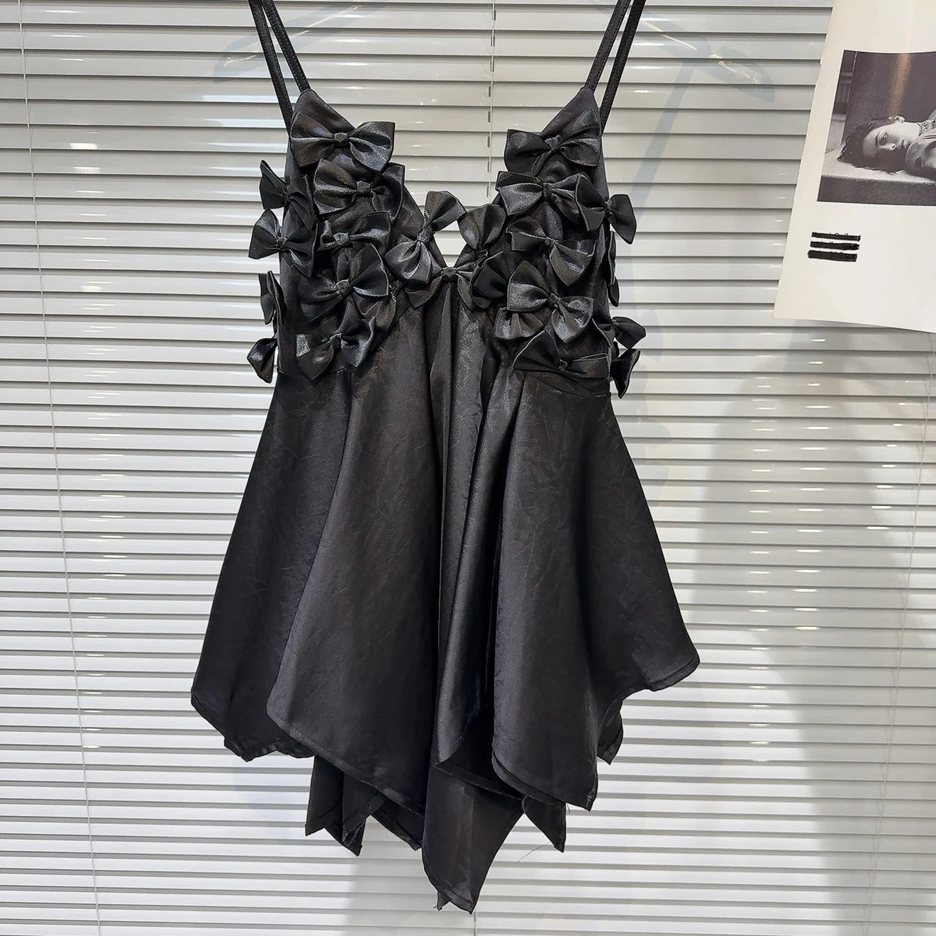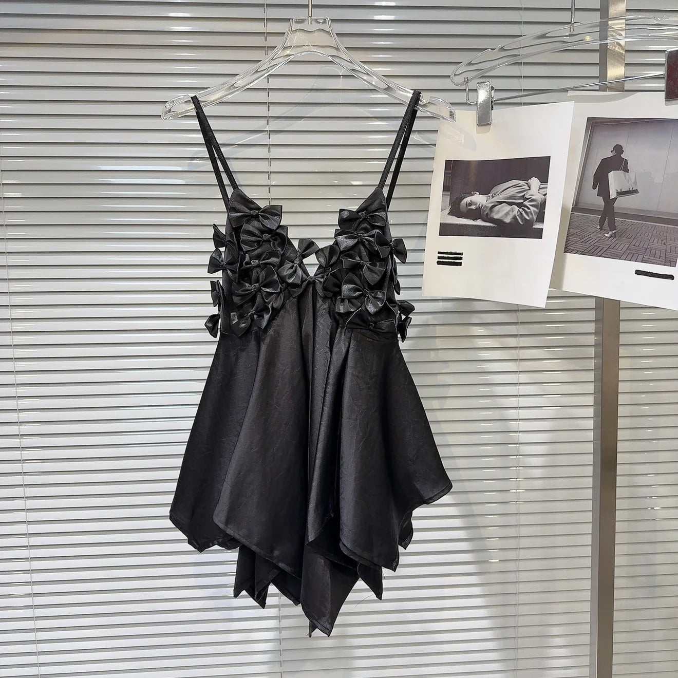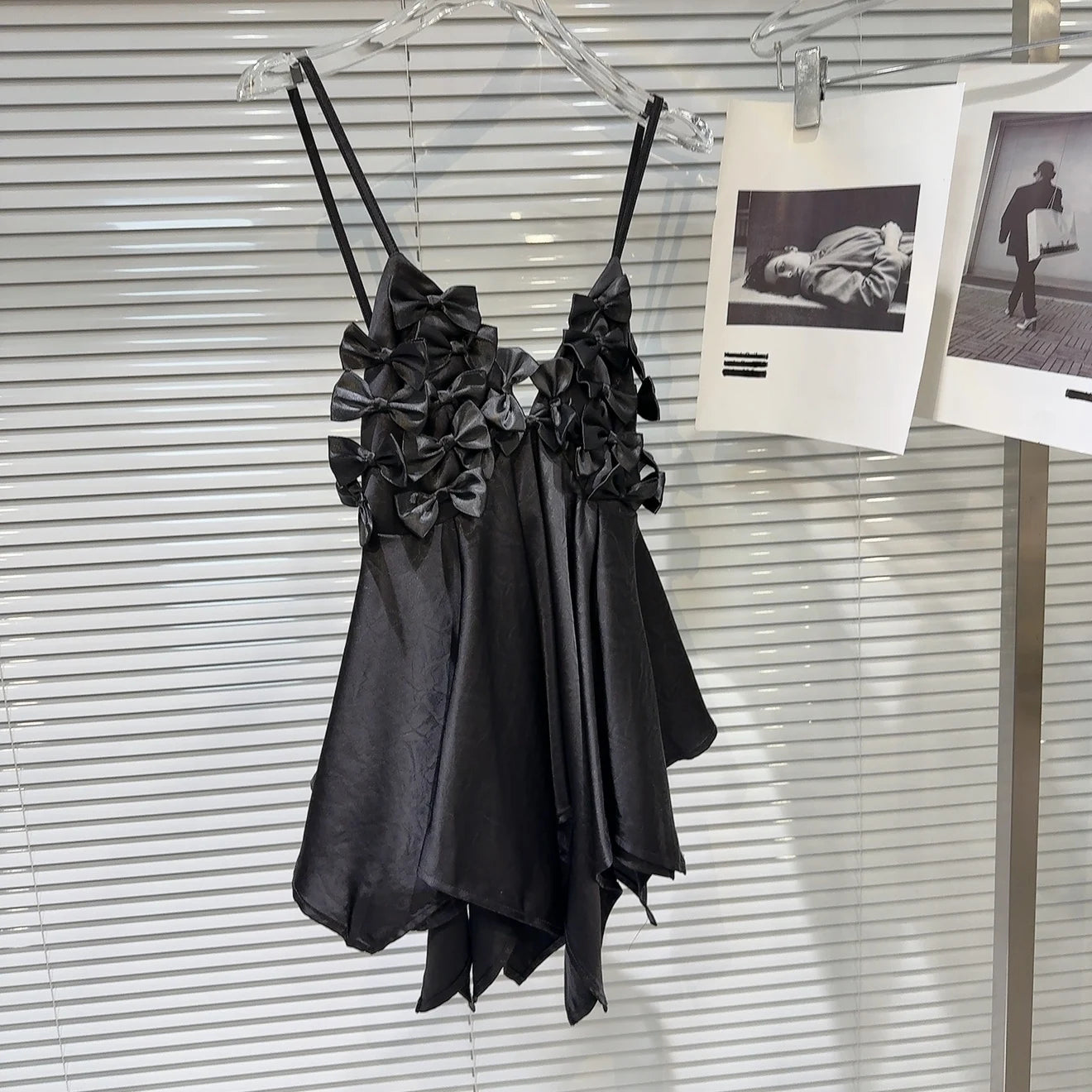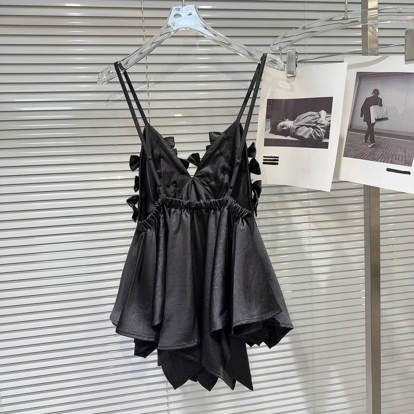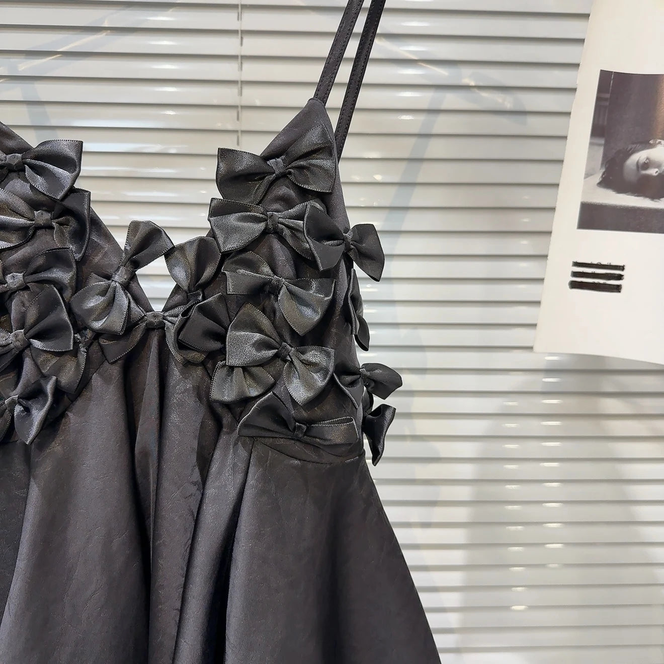 This sleeveless black tank top features a multi-bow, backless design crafted from a cotton and polyester blend with slight stretch. Made for spring and summer, it offers a comfortable fit with a solid pattern and high street style, ideal for women seeking a stylish yet breathable top.
