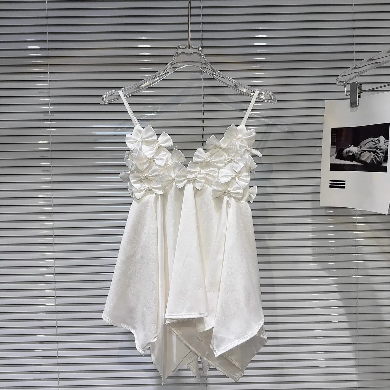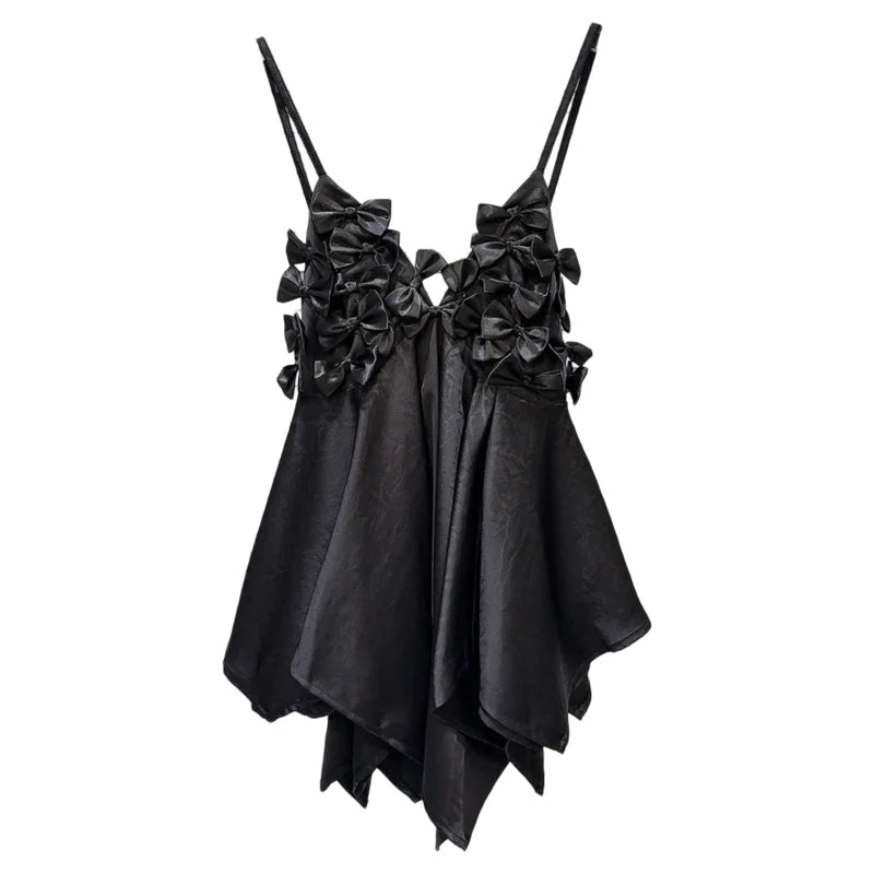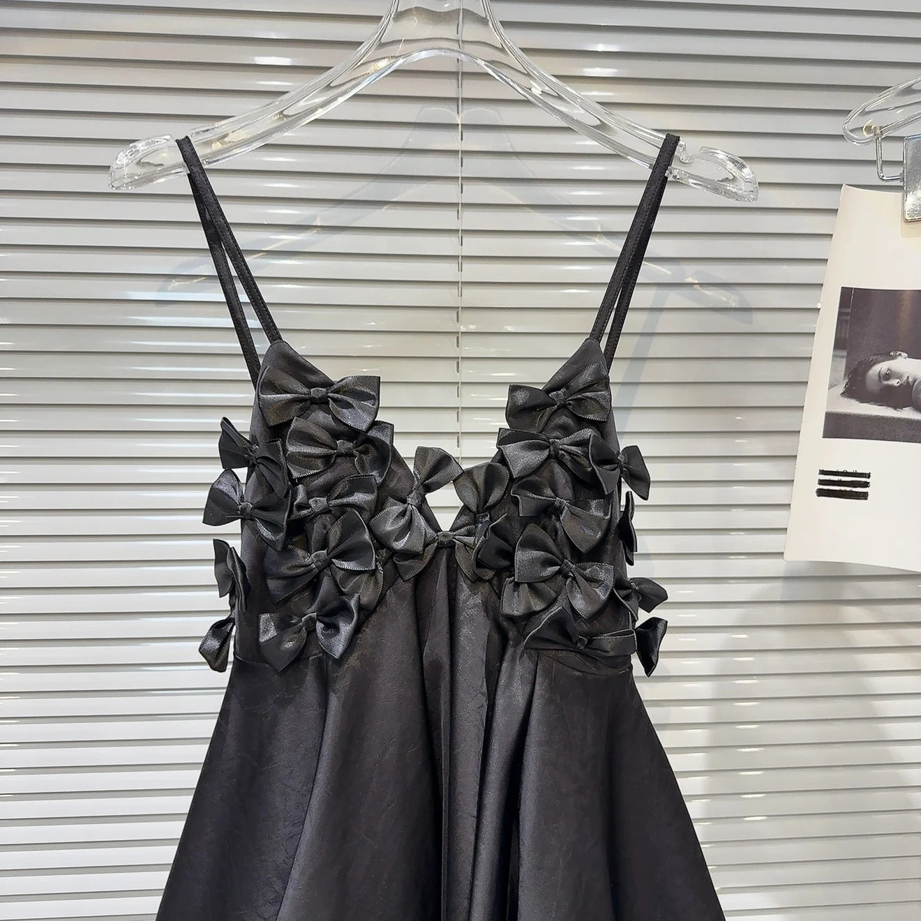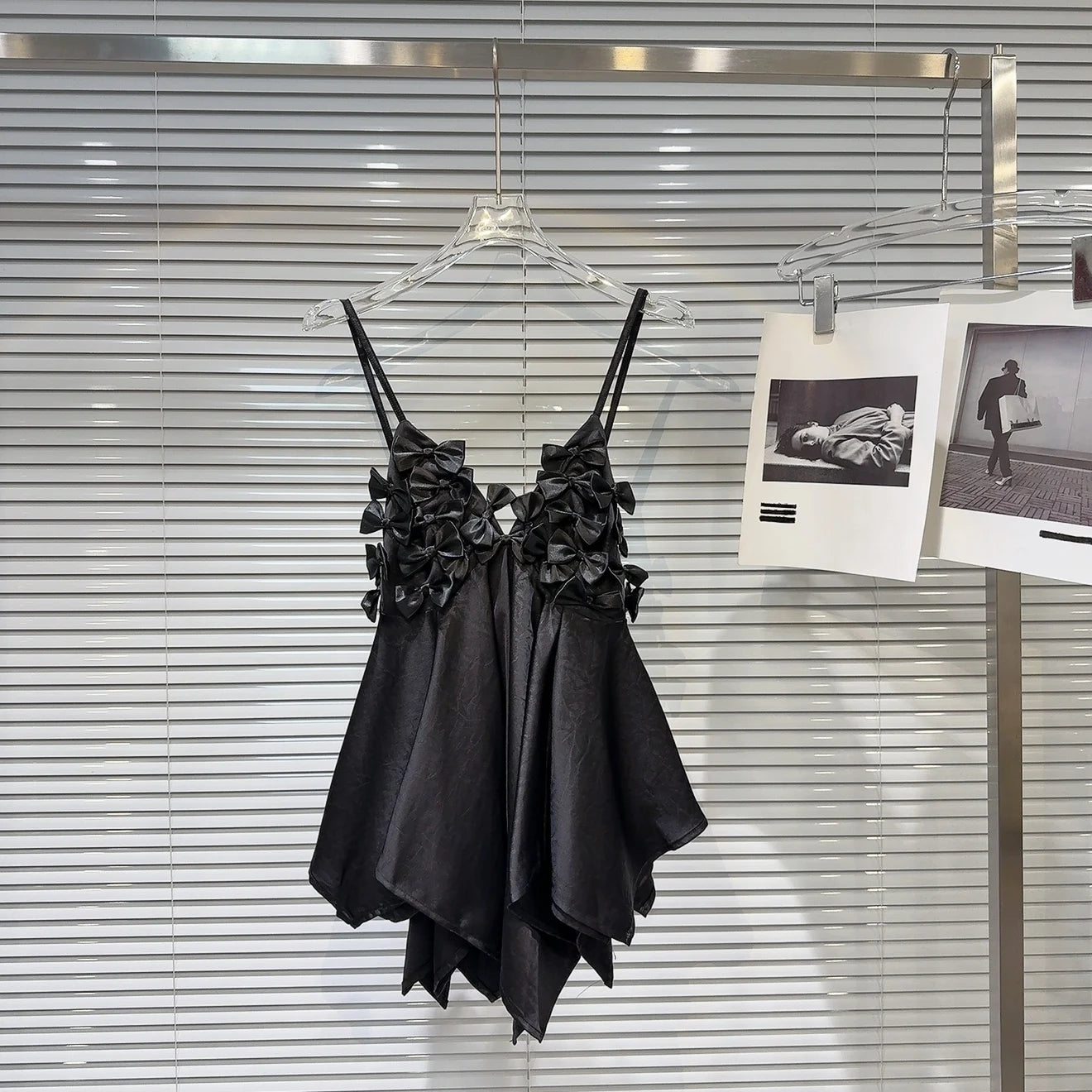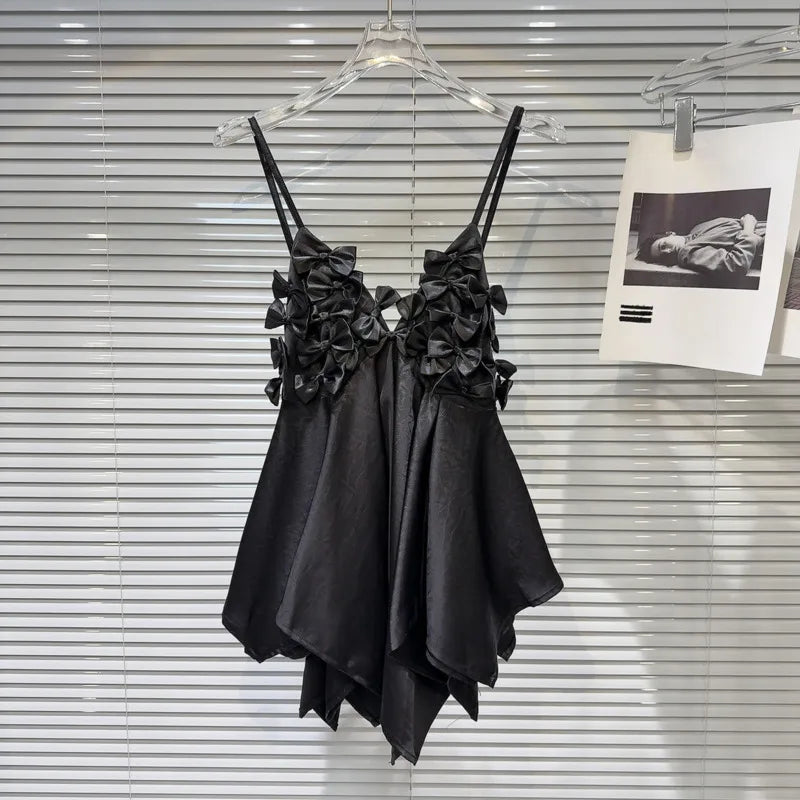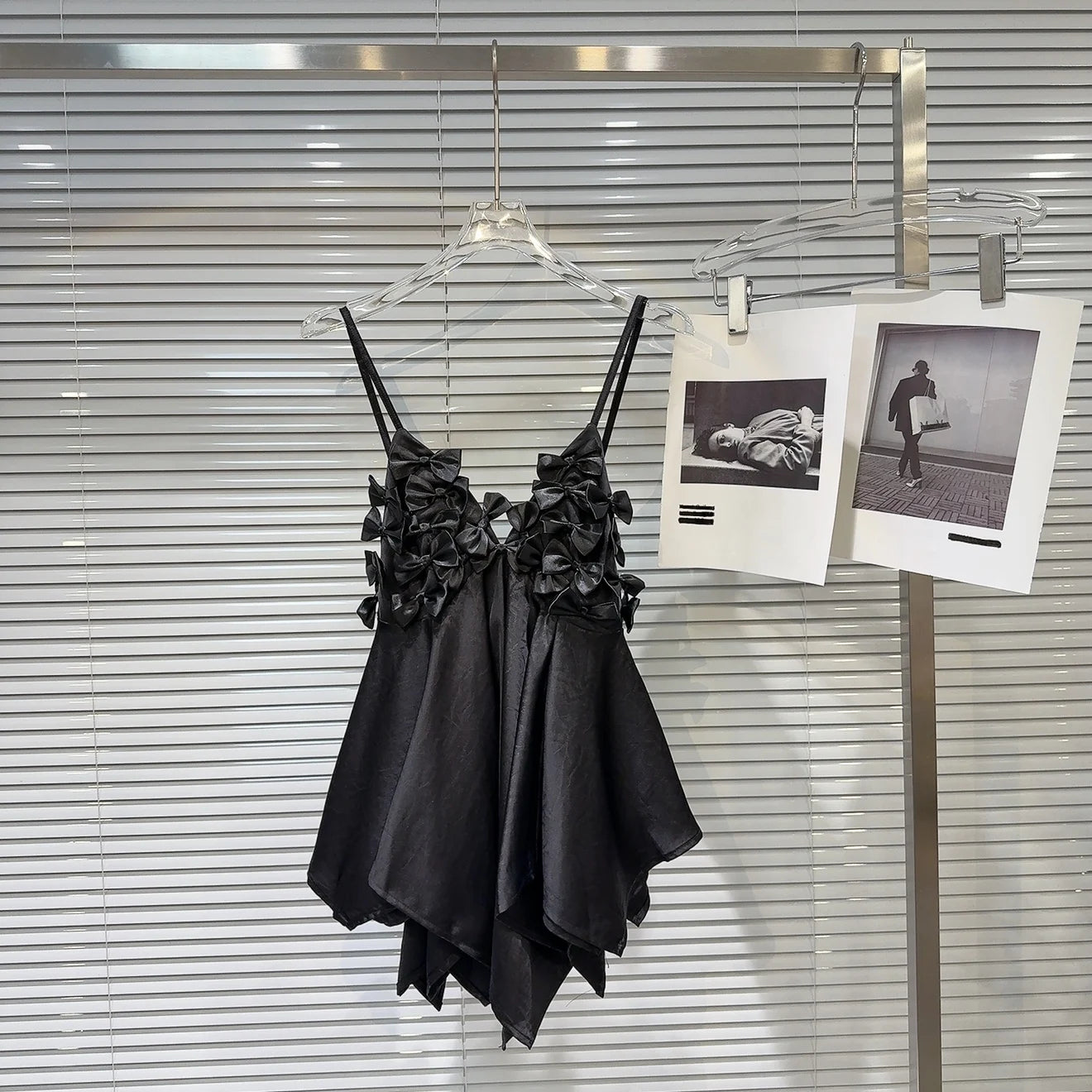 This sleeveless black tank top features a multi-bow, backless design crafted from a cotton and polyester blend with slight stretch. Made for spring and summer, it offers a comfortable fit with a solid pattern and high street style, ideal for women seeking a stylish yet breathable top.