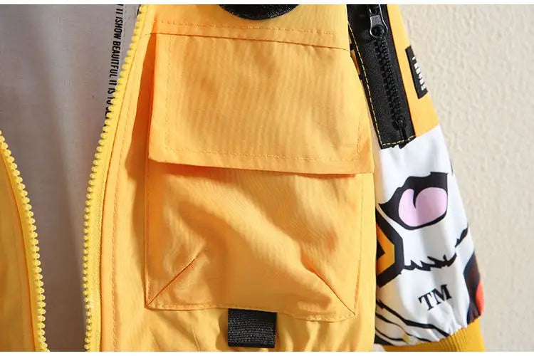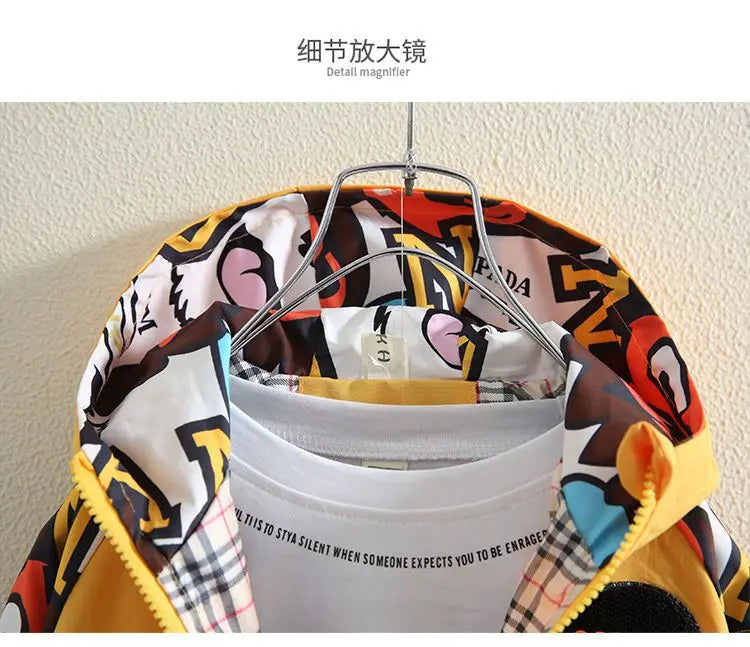 This children's hooded windbreaker features a full-zip closure and a regular fit, designed for ages 7 to 12. Made from a cotton and polyester blend with denim fabric, it offers lightweight protection suitable for all seasons. The jacket is unisex, with a cartoon pattern and a hood for added coverage. Its true-to-size fit ensures comfort and ease of wear.
